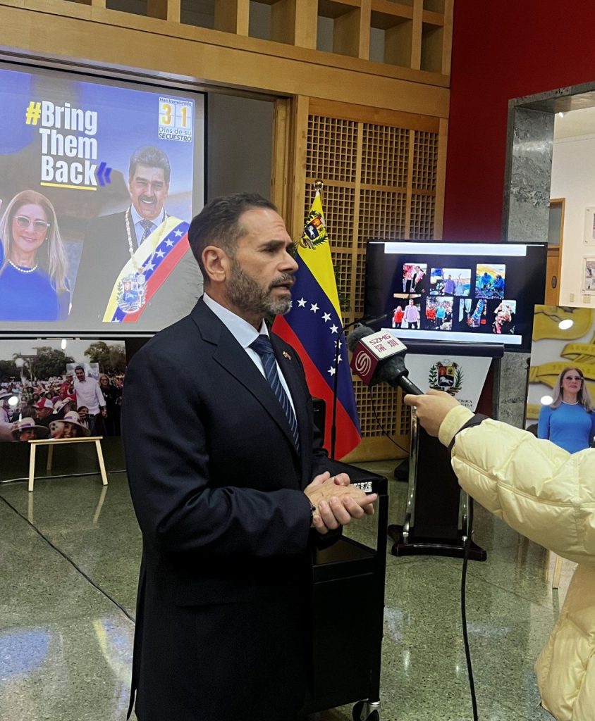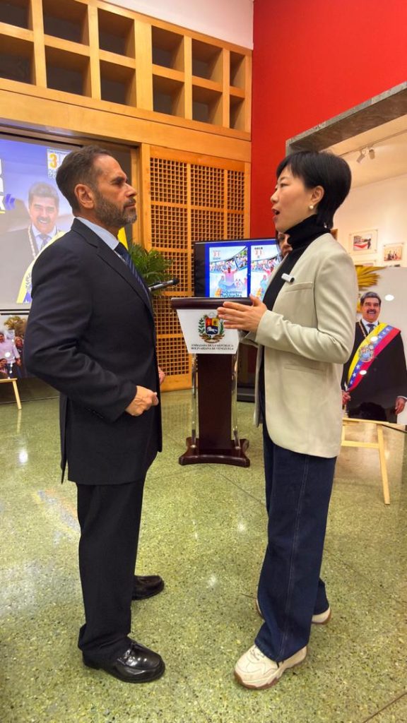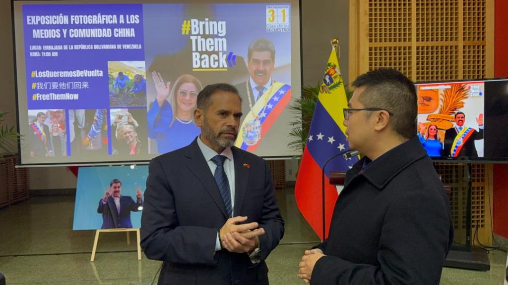 Beijing, 3 de febrero de 2026.- Al cumplirse un mes de la agresión militar de los Estados Unidos de América (EEUU) contra la República Bolivariana de Venezuela, que culminó con el secuestro del presidente constitucional en funciones del país suramericano, Nicolás Maduro Moros, y su esposa, la diputada Cilia Flores, se realizó una exhibición fotográfica en la sede la Misión Diplomática en Beijing, en el marco de la Acción Global #BringThemBack#LosQueremosdeVuelta#我们要他们回来.